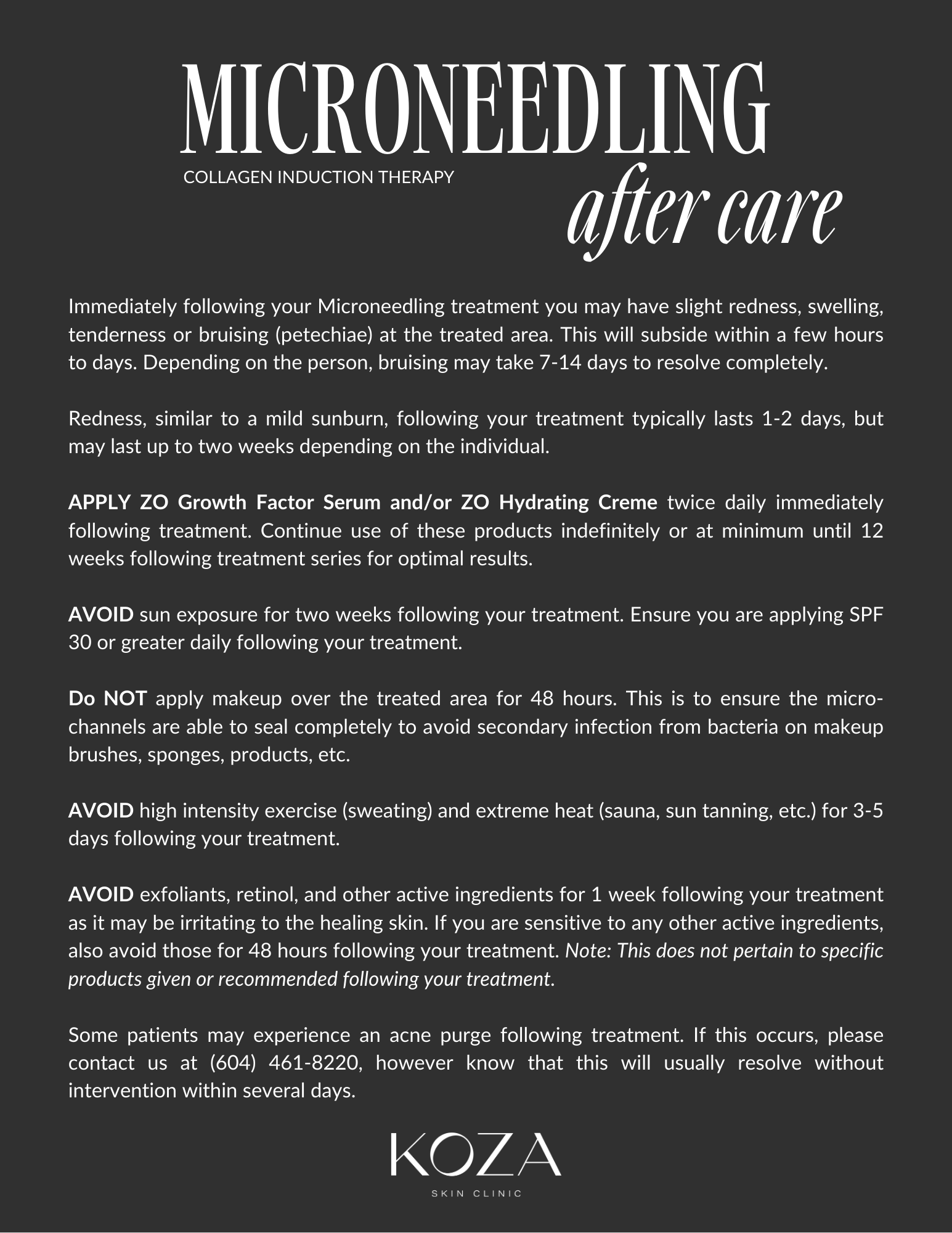 Usually, there is little to no downtime with Microneedling. Some people will notice redness and mild swelling, similar to a slight sunburn, for 24-48 hours after a session. Pinpoint bleeding and/or bruising may occur. Skin will be noticeably smoother and more radiant within one to two weeks, depending on the intensity of your treatment. Full results may take up to one month (or one cell turnover period) to become apparent.